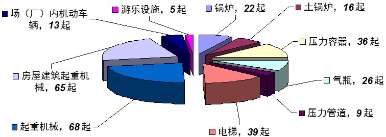 在299起事故中,鍋爐事故22起,土鍋爐事故16起,壓力容器事故36起,氣瓶事故26起,壓力管道事故9起,電梯事故39起,起重機(jī)械事故68起,房屋建筑起重機(jī)械事故65起,廠內(nèi)機(jī)動(dòng)車輛事故13起,游樂設(shè)施事故5起。