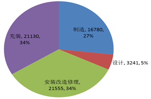 截至2015年底,全國共有特種設備生產(含設計、制造、安裝、改造、修理、氣體充裝)單位62706家,持有許可證68804張,其中:設計單位3241家,制造單位16780家,安裝改造修理單位21555家,移動式壓力容器及氣瓶充裝單位21130家。