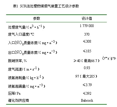 某電廠燃煤煙氣SCR法處理裝置的工藝設計參數見表1。該裝置1999年投運至今,運行狀況良好,各項指標完全達到設計性能要求。