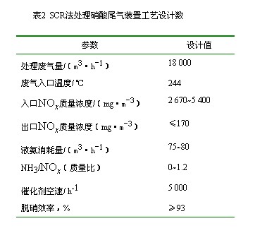 某化工廠用SCR法處理硝酸尾氣裝置的工藝設計參數見表2。該裝置1993年投入運行,脫硝效率達到93%以上,凈化尾氣達到排放標準,環境與社會效益顯著。